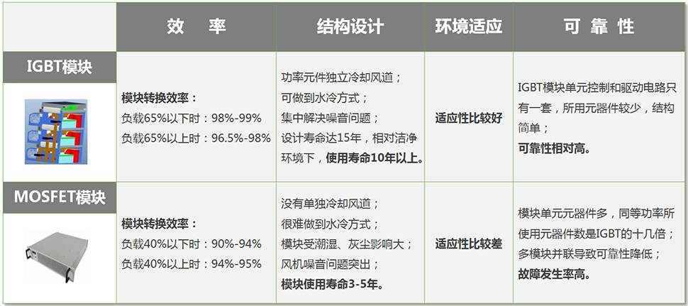 IGBT模塊比MOSFET模塊:轉換效率高3-4%、壽命長2-3倍、可靠性、環(huán)境適應性更好。