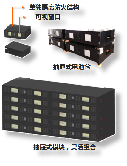 2、電池倉抽屜式設(shè)計方便更換 每倉內(nèi)有煙感、溫度監(jiān)測功能;可以設(shè)置水冷降溫、噴淋滅火功能。